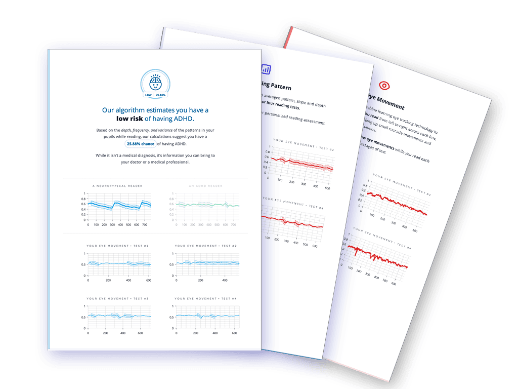 The Readable Technologies ADHD Test ends with a personalized report if you have a low, moderate, or high chance of ADHD. Just from 90 seconds of reading!